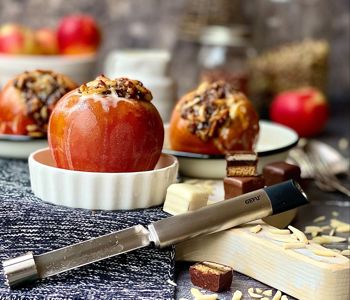 Das Kerngehäuse aus Äpfeln und Birnen wird mit dem Apfelentkerner sauber und schnell entfernt. Der gezahnte Ausstechrand gleitet mühelos in das Fruchtfleisch und befreit die Früchte von ihrem kernigen Innenleben. Für Bratäpfel unentbehrlich, aber auch für mit Preiselbeeren gefüllte Birnen, zum Beispiel zu Wildfleisch.